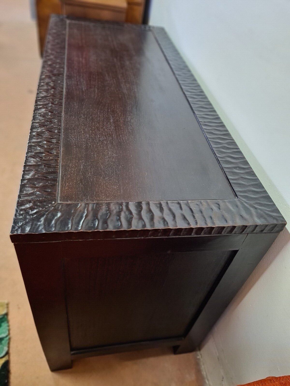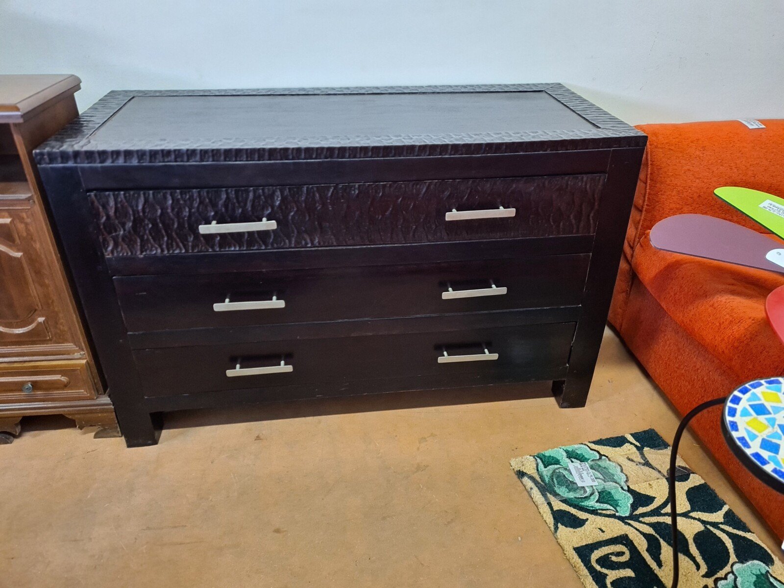 Comò Etnico marrone molto scuro a tre cassettoni.